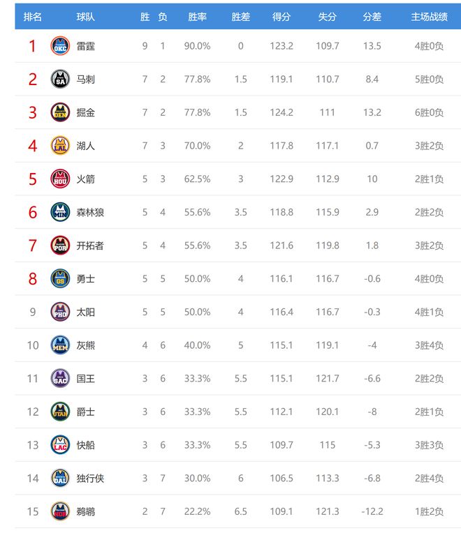 北京时间2025年11月9日,今日NBA有8场比赛,湖人、快船、掘金、马刺、太阳、独行侠、开拓者、鹈鹕参与其中,赛后西部排名发生了变化。